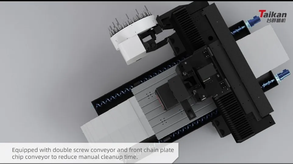 - Transportador de cavacos em espiral: um conjunto em cada lado da mesa de trabalho, com diâmetro de parafuso de 120 mm e grande seção transversal quadrada de aço, expelindo rapidamente os cavacos para fora da máquina.