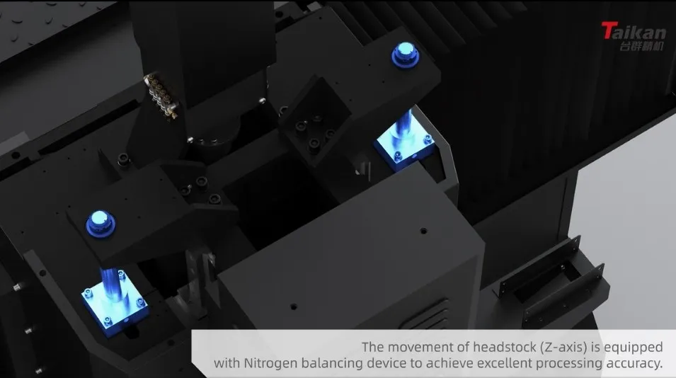 - Sistema de Balanceamento do Eixo Z: Utiliza pressão de nitrogênio para contrabalançar o peso da caixa do fuso e do carneiro, reduzindo a carga sobre o servomotor. Isso minimiza a vibração e a deformação, melhorando a precisão e a estabilidade da usinagem. Além disso, reduz o desgaste mecânico, prolongando a vida útil da máquina.