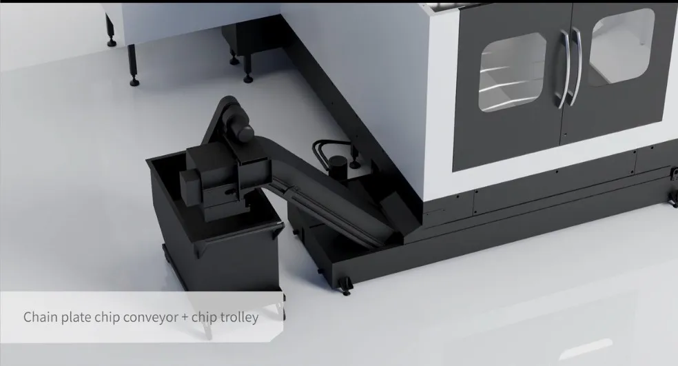 - Transportador de elevação de cavacos tipo corrente: localizado na extremidade da máquina, com inclinação de 45 graus, placa de corrente mais larga e barras raspadoras em formato de dentes de serra, coletando rapidamente os cavacos no pequeno transportador de cavacos.
