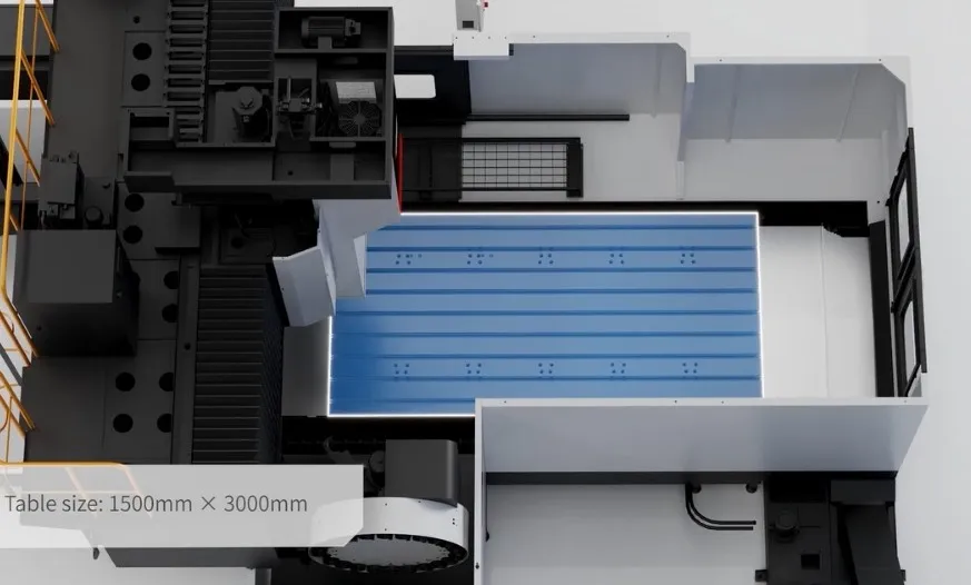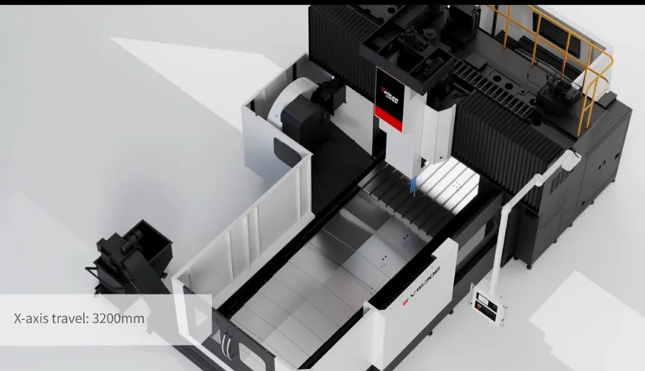 - Transportador de cavacos em espiral: um conjunto em cada lado da mesa de trabalho, com diâmetro de parafuso de 120 mm e grande seção transversal quadrada de aço, expelindo rapidamente os cavacos para fora da máquina.