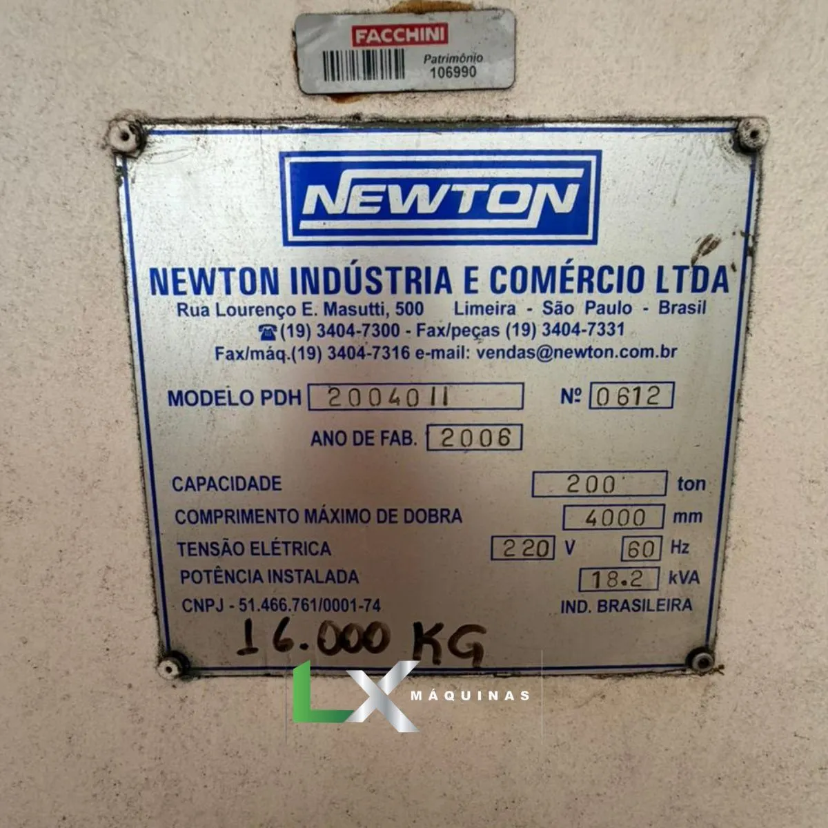 O código do modelo indica as capacidades principais da máquina: o “200” refere-se à força de dobra de 200 toneladas, e o “40” (ou 4000) indica o comprimento útil da mesa e do prensador, que é de 4.000 mm (4 metros).