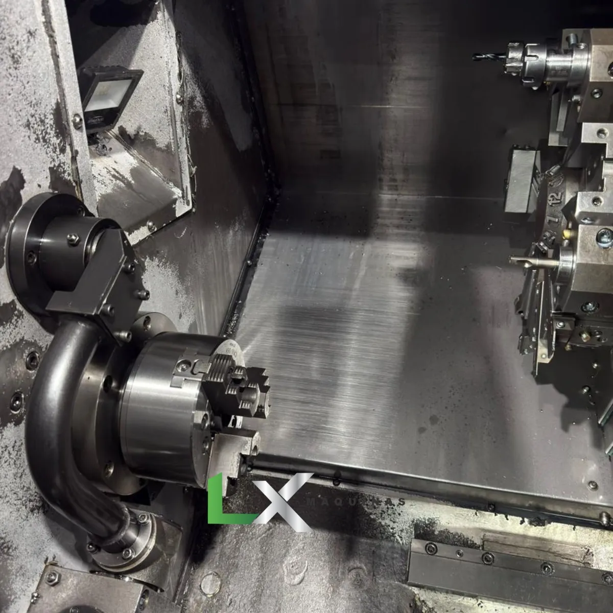 3. Quais recursos e acessórios esse torno possui? Resposta: Comando Fanuc 0i-TC, placa hidráulica de 6″, pré-setter, contraponto hidráulico, torre porta-ferramentas com 12 posições e transportador de cavacos — ideal para produção contínua e redução de setups.