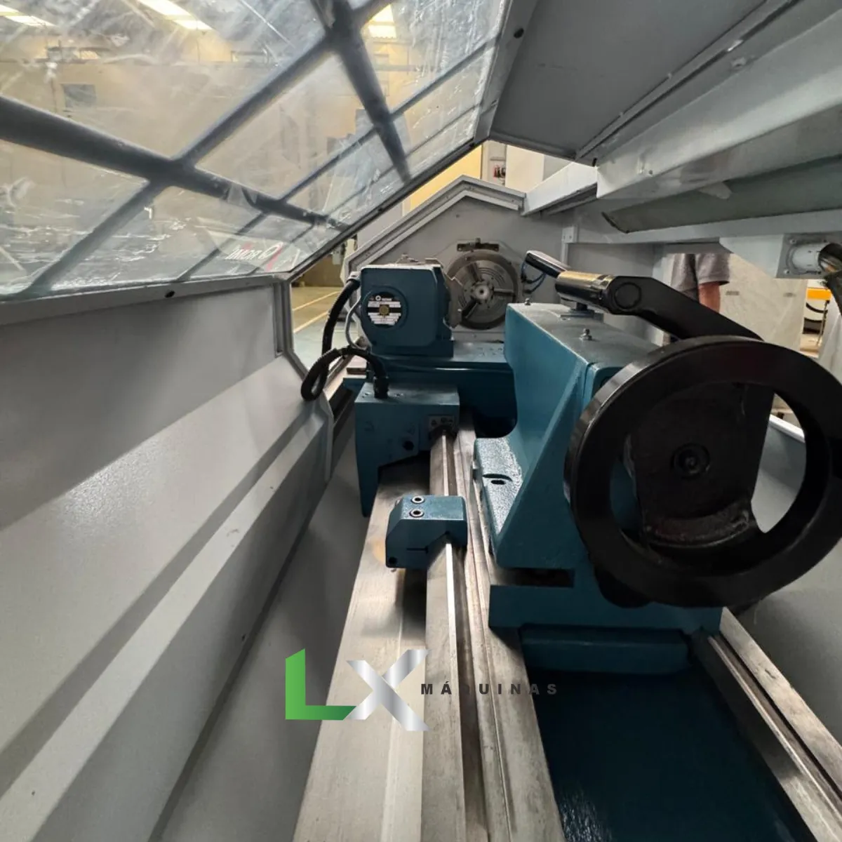 Isso permite usinar eixos longos e peças de médio porte com estabilidade e precisão.
