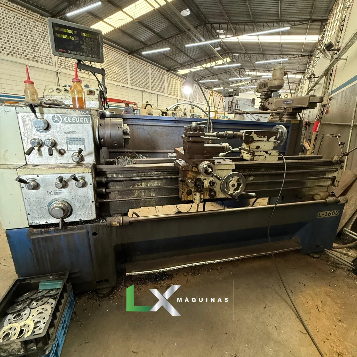 • O CLEVER L1660 (2014) é um torno mecânico pesado para operações de usinagem geral. Especificações principais: diâmetro sob barramento 410 mm, diâmetro sob a cava 580 mm, comprimento entre pontas 1500 mm, furo no eixo/árvore 52 mm e largura do barramento 380 mm.