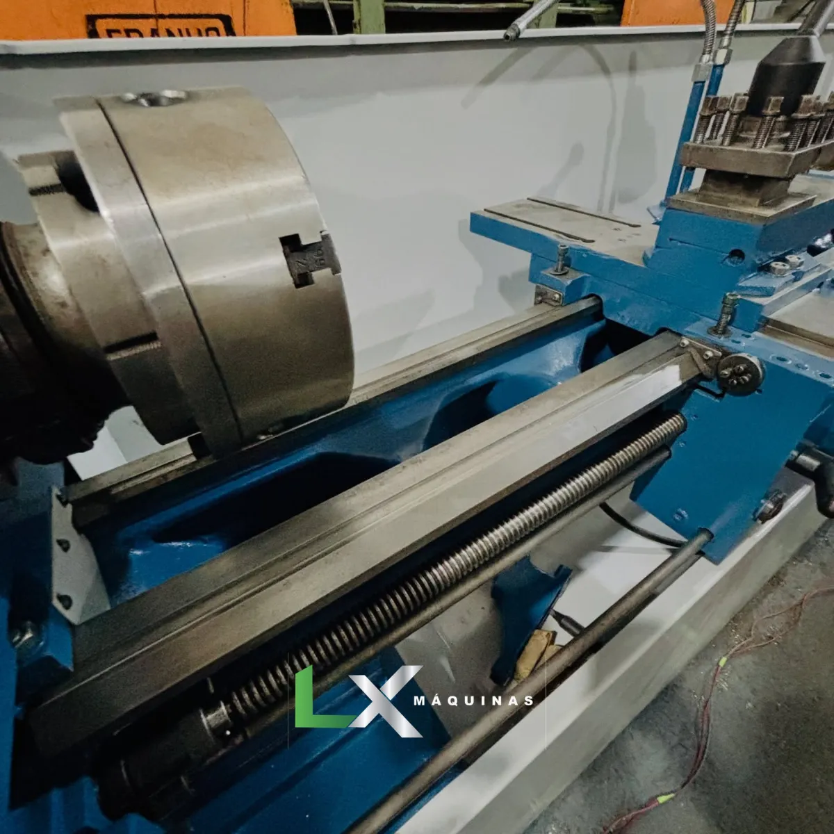 O torno mecânico Romi ID20 possui aproximadamente 380 mm de diâmetro sobre o barramento e 1500 mm entre pontas, permitindo usinar eixos, buchas e peças cilíndricas de médio porte com boa estabilidade.